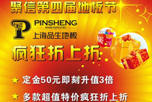 品生地板:地板節(jié)瘋狂“折上折” 活動期間定單客戶,交50元定金即刻升值為150元。多款特價仿實(shí)木地板69元/M2起,實(shí)木復(fù)古地板最低僅售248元/M2,并參加聚信商場活動,并可再省10-30元/M2的優(yōu)惠;定單即獲贈精美禮品。<<點(diǎn)擊查看詳情