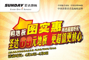 圣達(dá)地板與您共建未來生活 凡活動期間進(jìn)店客戶均有精美禮品贈送。4月25日前預(yù)購實(shí)木及實(shí)木復(fù)合地板30㎡以上,強(qiáng)化地板50㎡以上并繳意向金者可享受100抵200元,200抵500元;強(qiáng)化地板勞動價 69元/ ㎡起。 <<點(diǎn)擊查看詳情