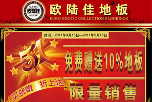 歐陸佳地板迎“五一”回報社會 歐陸佳地板迎“五一”,回報社會,贈送10%地板,限量銷售。時間:2011年4月16日—2011年5月16日;凡購買歐陸佳地板的用戶贈送歐陸佳專用腳墊一個;購買歐陸佳地板即贈送歐陸佳高級拖把一個。 <<點(diǎn)擊查看詳情