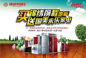 買錦繡前程地板送國美永樂家電 活動期間訂購錦繡前程地板全系列地板產(chǎn)品、全系類木門產(chǎn)品,均可享受8.5折優(yōu)惠;所有錦繡前程訂單客戶在國美永樂各門店內(nèi)購買家電可額外享受總價3%的錦繡前程家電基金補(bǔ)貼。<<點(diǎn)擊查看詳情