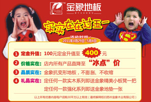 金象地板實(shí)實(shí)在在過五一 100元定金升值至400元;店內(nèi)所有產(chǎn)品直降至“冰點(diǎn)”價;金象抗變形地板,不變形、不縮收;定任何一款實(shí)木系列即送金象精美小板凳一把。 定任何一款強(qiáng)化系列即送金象地墊一張。<<點(diǎn)擊查看詳情
