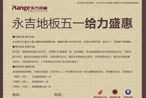 揚(yáng)子地板:買地板就要買保障! 大品牌,大保障!震撼“簽”動五·一,揚(yáng)子終極給力! 買地板送全家保險 簽訂單等于簽保單;交訂金 簽訂單 訂金最高翻6番;明星產(chǎn)品 神秘底價簽售;抽簽中液晶電視 循環(huán)抽 再送禮。 <<點(diǎn)擊查看詳情