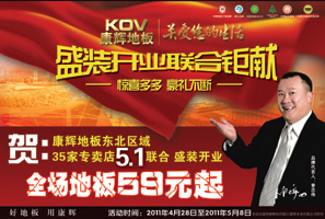 康輝地板東北區(qū)域五一活動盛大起航 康輝地板35家專賣店同時盛裝開業(yè),大亞水洗基材零售價69元起裸板價;大亞基材手抓紋系列59元起裸板價;并有多款特價板提供,全場六-七折起,(工程板不參與);另購康輝地板送高檔蠶絲被。 <<點(diǎn)擊查看詳情