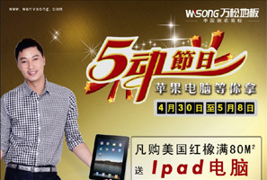 萬松地板五動節(jié)日蘋果電腦等你拿! 凡購美國紅橡滿80平方送IPAD電腦;80平方以上送海爾洗衣機(jī)一臺;50~79平方送格蘭仕微波爐一臺;30~49平方送萬松實(shí)木椅一個;30平方以下送精美禮品一份。 <<點(diǎn)擊查看詳情