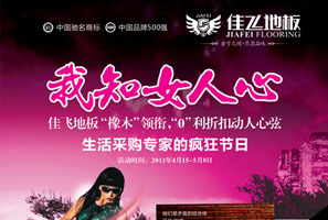 佳飛地板——五一我知女人心 佳飛精品地板,震撼登場三重驚喜 活動期間,進(jìn)店即送精美禮品一份 訂購便有大禮相送,紅木高檔小家具、品牌家電統(tǒng)統(tǒng)等著您! 超低秒殺實(shí)木地板、強(qiáng)化地板、實(shí)木復(fù)合地板最低4.5折起。<< 點(diǎn)擊查看詳情