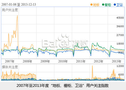 通過2007-2013年"地板、櫥柜、衛(wèi)浴"的用戶關(guān)注指數(shù)對(duì)比圖可以發(fā)現(xiàn),在2007-2008年期間,"地板"用戶關(guān)注明顯領(lǐng)先于衛(wèi)浴、櫥柜,其中2007年地板關(guān)注指數(shù)更是呈爆發(fā)性增長(zhǎng)。而經(jīng)過2008年的小幅度波動(dòng)之后,"地板"用戶關(guān)注指數(shù)開始...[詳細(xì)]