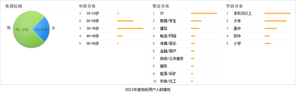 根據(jù)上圖數(shù)據(jù)分析,地板互聯(lián)網(wǎng)用戶男性占據(jù)75.37%,女性占據(jù)24.63%,由此說明:關(guān)注地板行業(yè)的人群以男性為主;