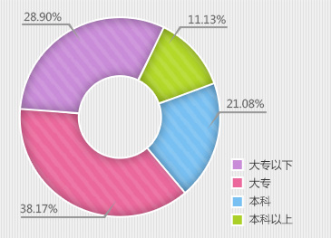 2013年互聯(lián)網(wǎng)地板求職人才學(xué)歷中,大專學(xué)歷占38.17%,大專以下占28.90%,本科占21.80%。這說明隨著地板行業(yè)的持續(xù)性發(fā)展和人們對地板消費需求的增加,使得越來越多的知識階層加入到這個行業(yè)中來。同時,良好的趨勢也表明未來加入到地板行業(yè)的人才學(xué)歷將會普遍得到提高。[詳細]