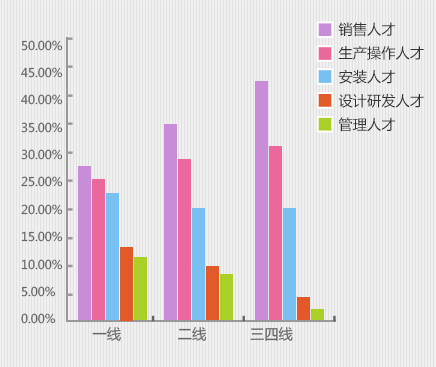 從3-5年工作經(jīng)驗數(shù)據(jù)圖看,銷售人才與生產(chǎn)操作人才均占到29%,安裝人才占26%,設(shè)計研發(fā)人才占36%、管理人才占35%。5-10年的求職人才比例相對來說下降了不少,但這類人才處于新老交替的中堅力量,既有豐富的工作經(jīng)驗,而且也處于工作發(fā)展的黃金期,上升空間很大...[詳細]